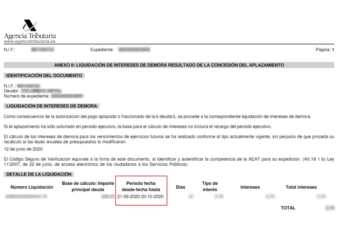 No obstante, es conveniente que revises las fechas a partir de las cuales se devengarán intereses de demora consultando el documento de la concesión del aplazamiento/fraccionamiento de pago sin garantía que puedes obtener siguiendo estos comentados en el punto anterior. Dentro de éste encontrarás el apartado Anexo II: LIQUIDACIÓN DE INTERESES DE DEMORA RESULTADO DE LA CONCESIÓN DEL APLAZAMIENTO donde puedes consultar dichas fechas.