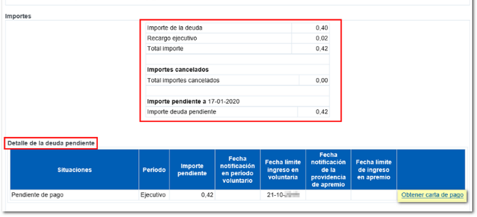 Para poder tramitar la liquidación, se deber generar la comúnmente conocida “Carta de pago" la cual se puede obtener mediante la gráfica con el detalle pendiente de deuda pulsando en "Obtener carta de pago".